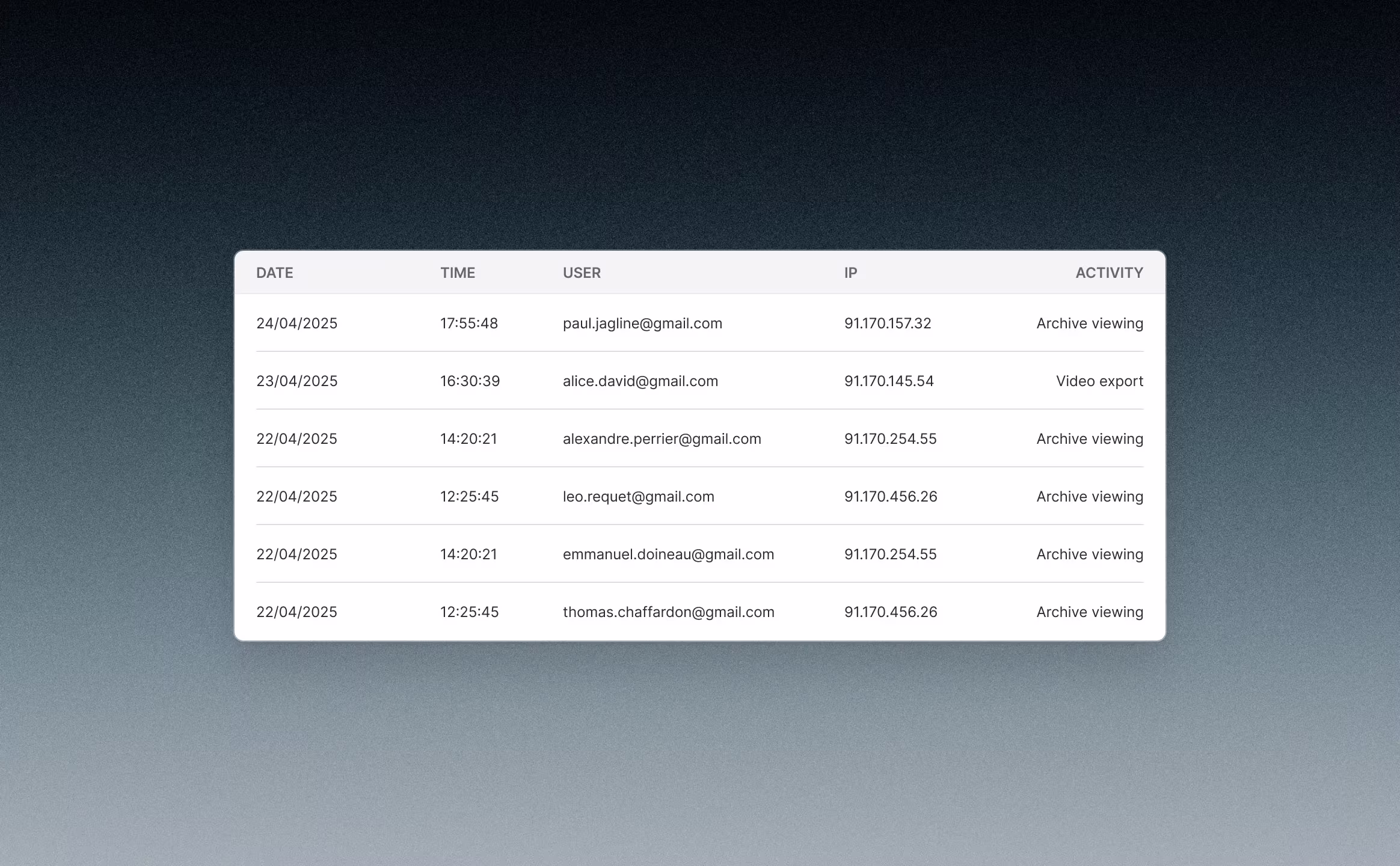 Only authorized officers within the local authority can view relevant videos or snapshots. Every action is logged and fully traceable (viewing history, date, time, etc.).